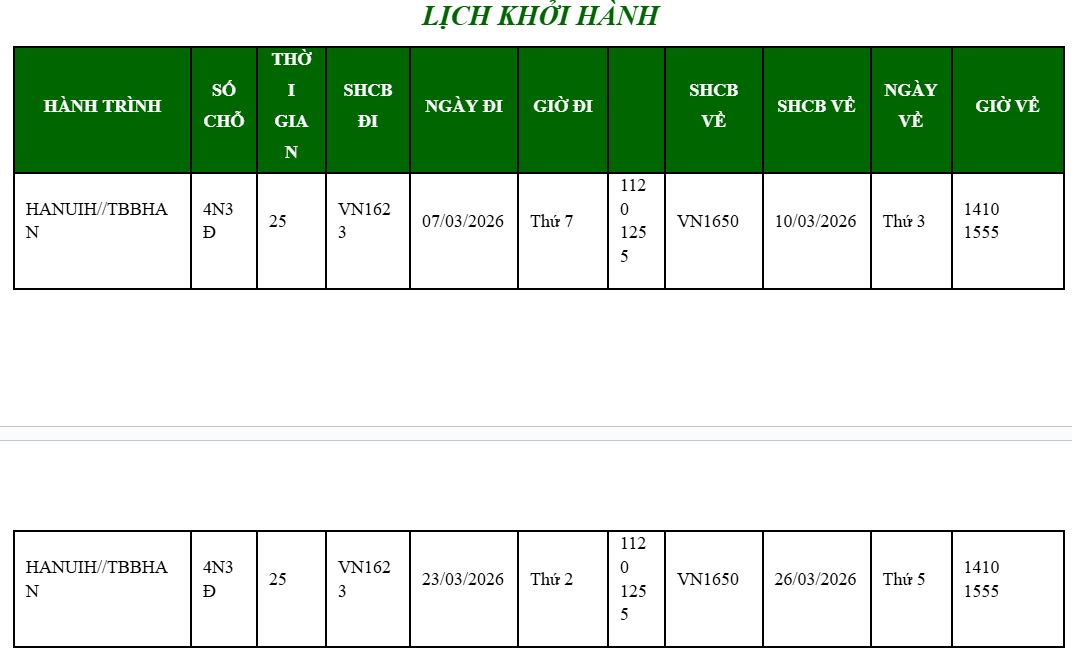LƯU Ý: GIỜ BAY CÓ THỂ THAY ĐỔI THEO LỊCH CỦA HÀNG KHÔNG VIETNAM AIRLINES. NẾU GIỜ BAY BỊ THAY ĐỔI, CHÚNG TÔI SẼ SẮP XẾP LẠI LỊCH TRÌNH NHƯNG VẪN ĐẢM BẢO ĐẦY ĐỦ CÁC ĐIỂM THĂM QUAN NHƯ ĐÃ CAM KẾT.