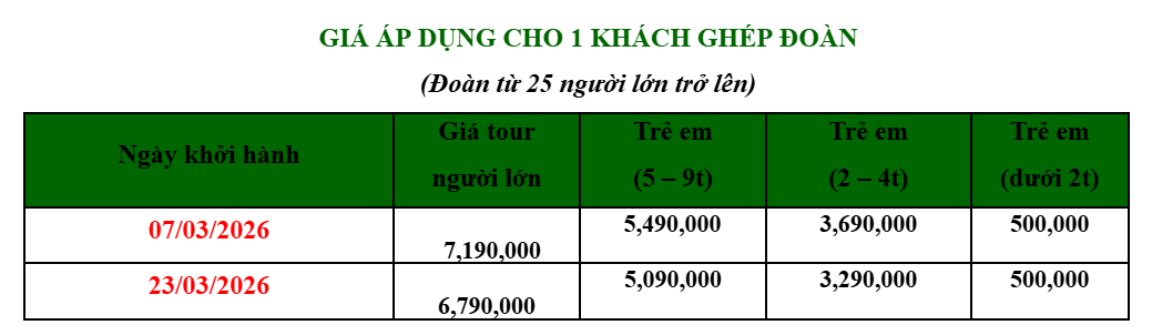 Giá tour trẻ em : Áp dụng theo bảng giá. Độ tuổi sẽ được tính từ ngày sinh đến ngày khởi hành.